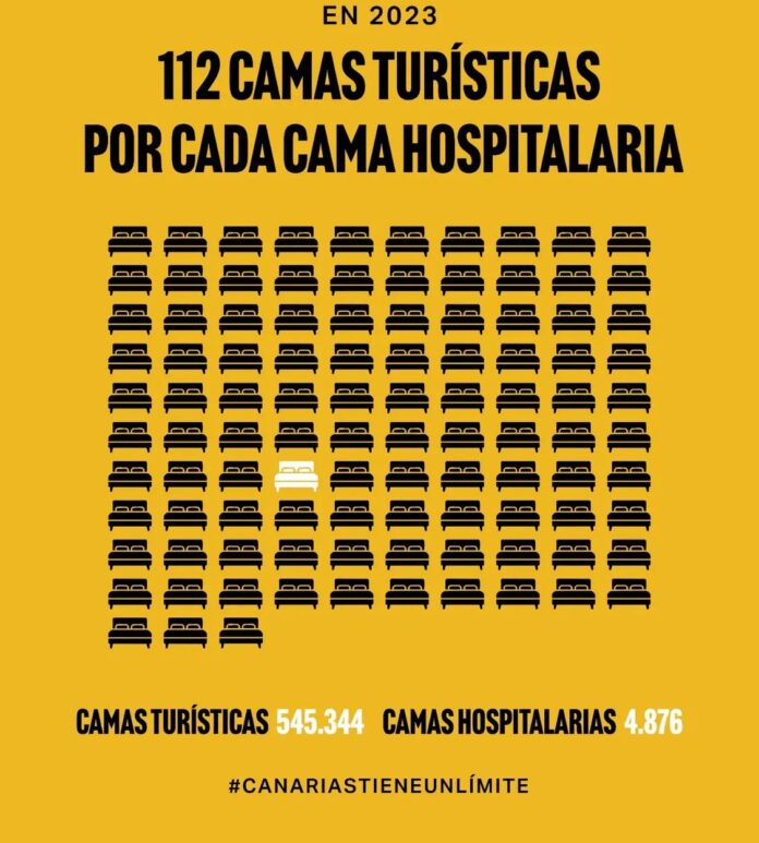 En las últimas tres décadas, el archipiélago incrementó hasta un 65% sus camas turísticas, pasando de las 330.250 que había en 1996 a 545.344 en 2023, mientras que en ese mismo periodo las camas hospitalarias públicas apenas han aumentado un 2%, pasando de 4.776 a 4.876, es decir, solo 100 camas más en 30 años, según datos oficiales del ISTAC y del Ministerio de Sanidad. En cifras absolutas, esto supone más de 215.000 nuevas camas turísticas frente a solo 100 camas hospitalarias en 30 años. Como consecuencia, hoy existen en Canarias más de 1000 camas turísticas por cada cama hospitalaria, una proporción que evidencia las prioridades del modelo económico y territorial implantado en las islas.