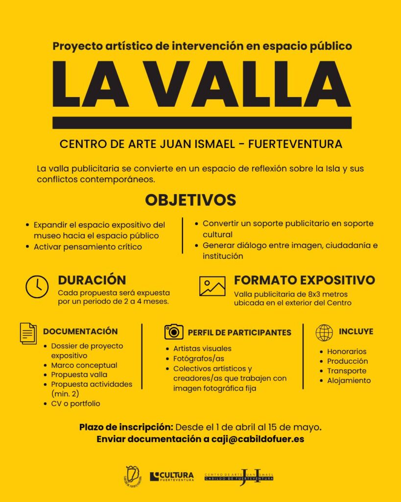 El Cabildo de Fuerteventura, a través de la Consejería de Cultura, ha puesto en marcha el proyecto artístico ‘La Valla’. La iniciativa propone convertir la valla publicitaria situada frente al Centro de Arte Juan Ismael (CAJI) en un espacio de pensamiento visual y reflexión crítica. El proyecto artístico ‘La Valla’ sale a la calle desde el «CAJI».
