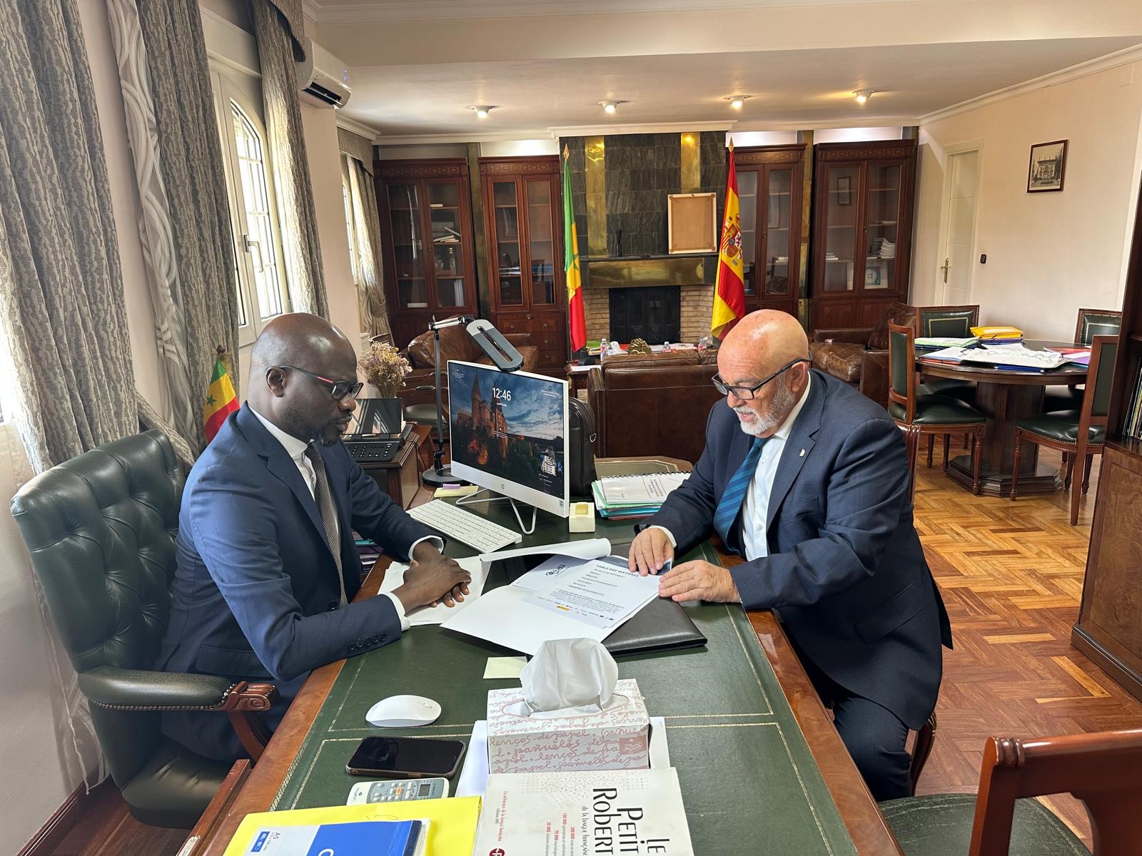 El presidente de la Cámara de Comercio de Fuerteventura, Juan Jesús Rodríguez Marichal, se reunió hoy con el embajador de la República de Senegal en España, Ibrahima Al Khalil Seck, en la sede de la Embajada en Madrid. El encuentro tuvo como objetivo reforzar la colaboración institucional y empresarial entre ambos territorios en el marco de AFRICAGUA CANARIAS 2025, foro internacional sobre agua y energías renovables que se celebrará los días 20 y 21 de noviembre en Fuerteventura.