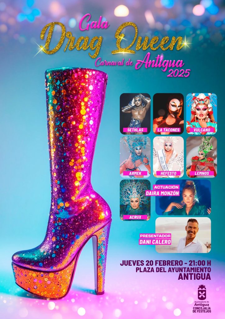 Una selección de las mejores drags de Canarias, Sethlas, La Tacones, Vulcano, Armek, Hefesto, Lemnos, Acrux y la artista Daira Monzón, suben al escenario del Carnaval de Antigua este jueves por la tarde, presentadas por Dani Calero durante la Gran Gala Drag Queen.